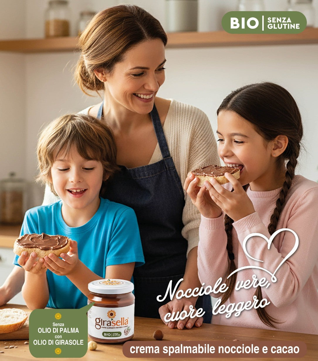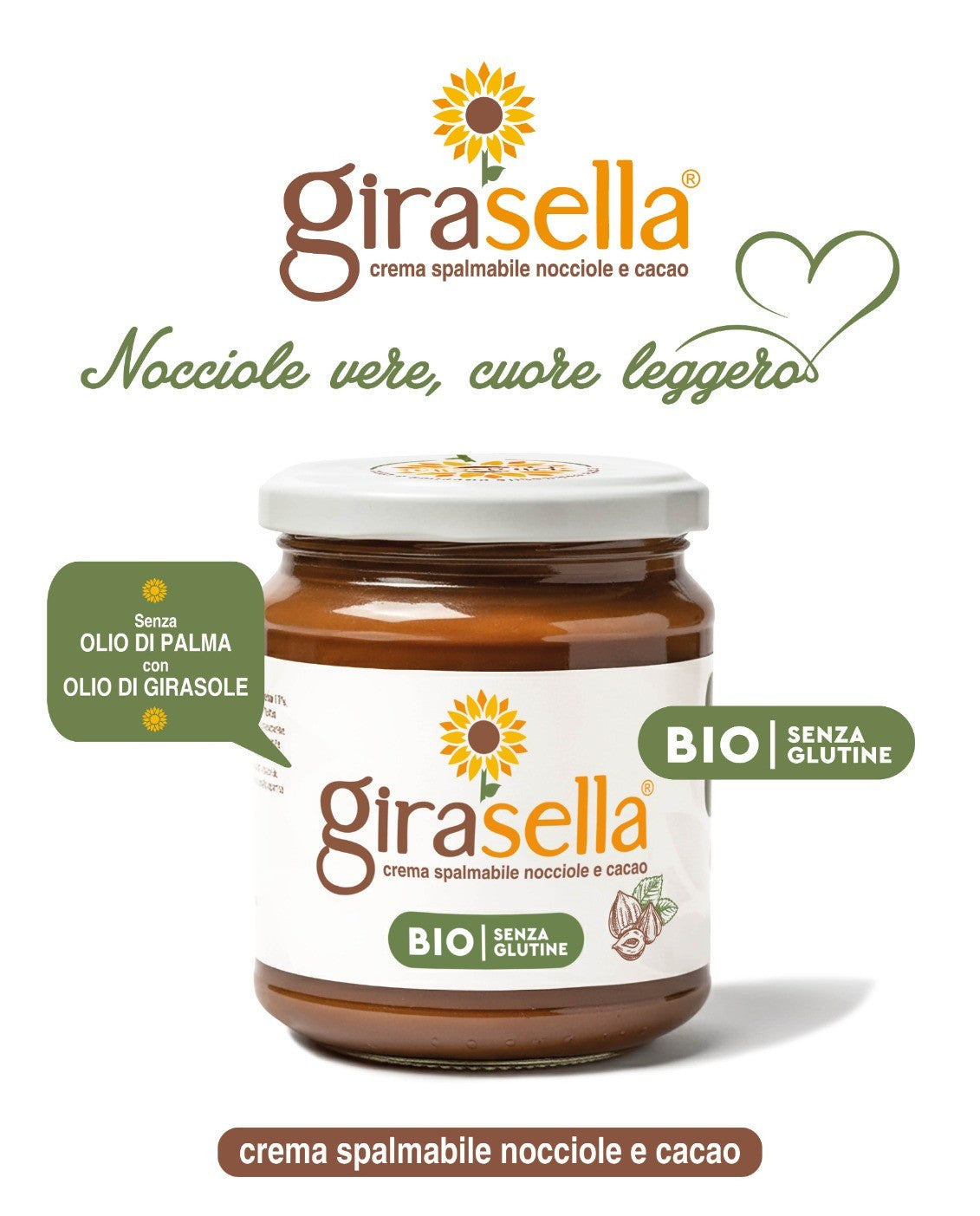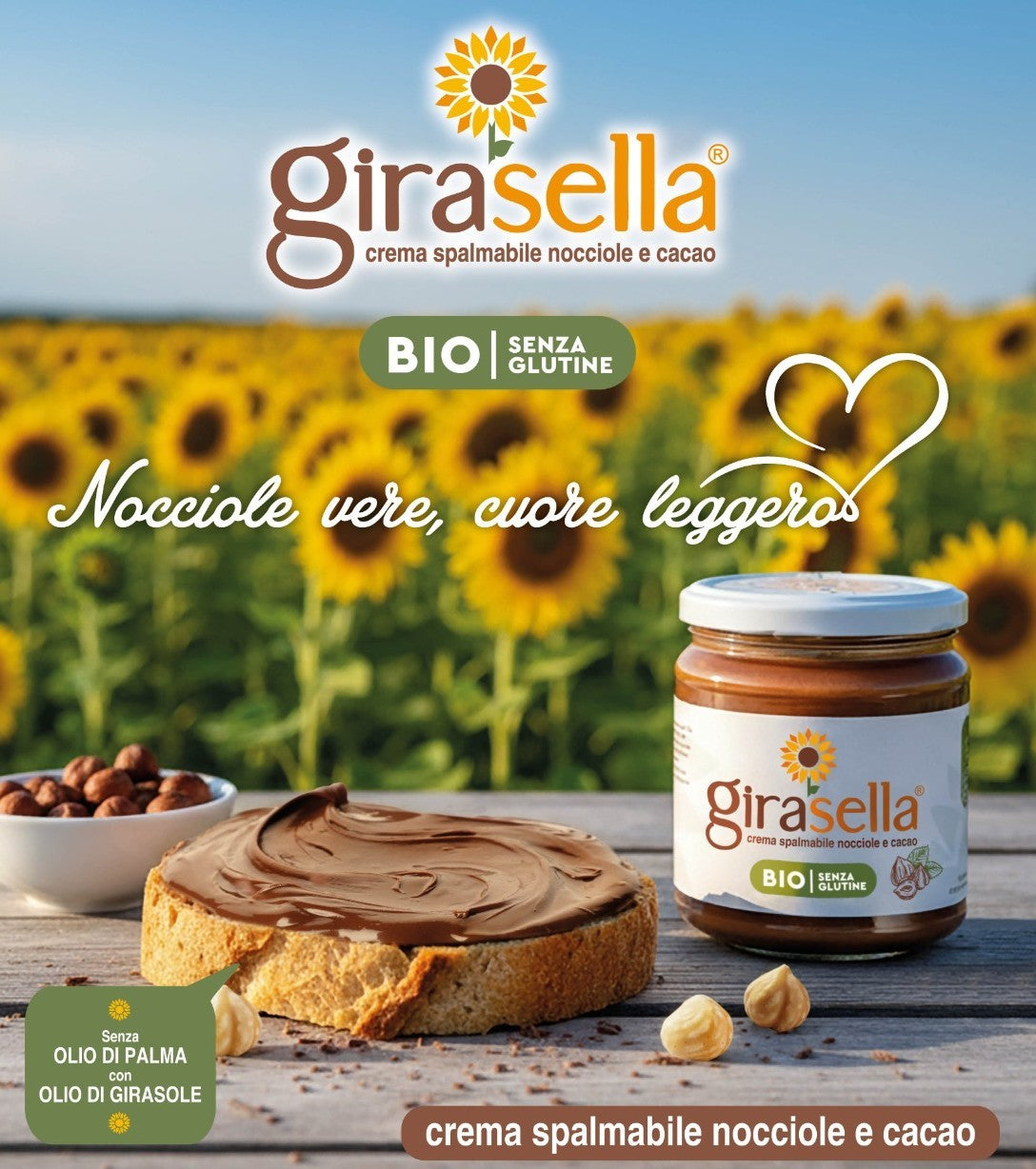 Girasella è una crema spalmabile biologica a base di nocciole e cacao, pensata per chi cerca un’alternativa più naturale e genuina alle creme industriali.